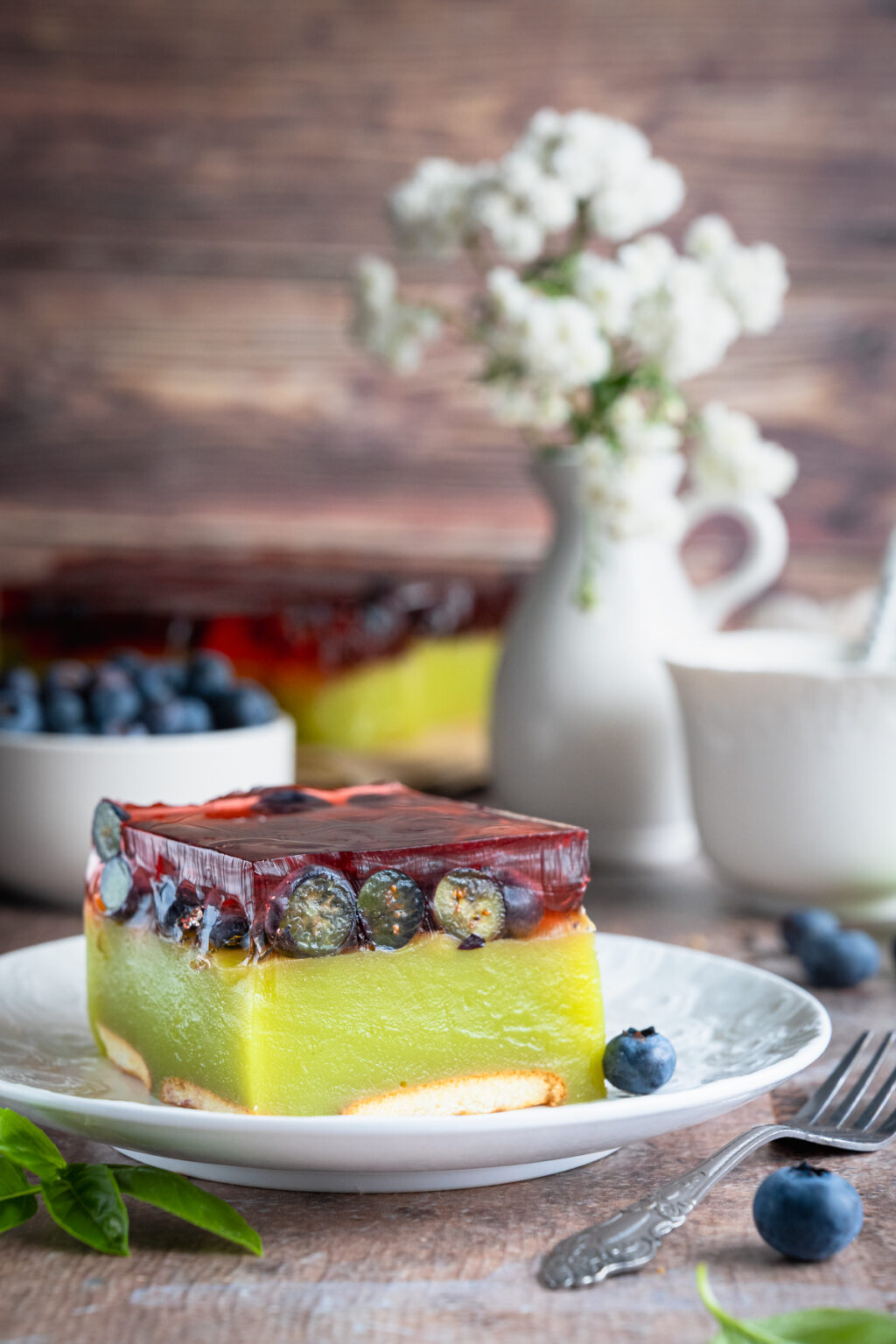 Lekkie, orzeźwiające i pięknie wyglądające ciasto Zielona Pokusa to idealny deser bez pieczenia na letnie dni! Połączenie delikatnych biszkoptów, kremowej masy z zielonego soku i budyniu oraz poziomkowej galaretki z borówkami nie tylko zachwyca smakiem, ale też cieszy oko swoją owocową kolorystyką. To ciasto nie wymaga pieczenia, a jego przygotowanie jest proste i szybkie. Aby go zrobić wystarczy Ci kilka minut potrzebnych na zrobienie budyniu + oczekiwanie na stężenie galaretki 😉