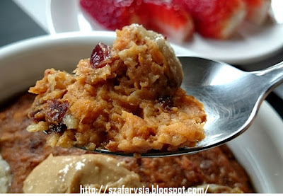 Pieczona owsianka bananowo- batatowa z owocami suszonymi i orzechami ziemnymi.