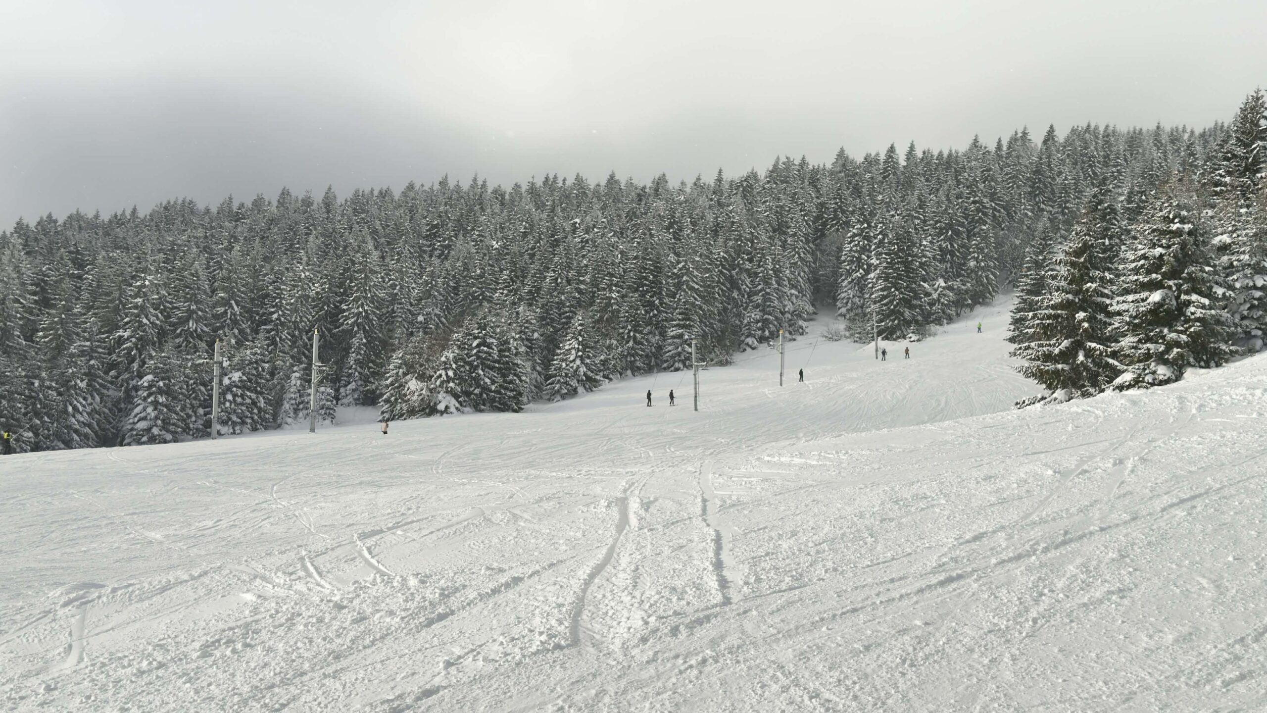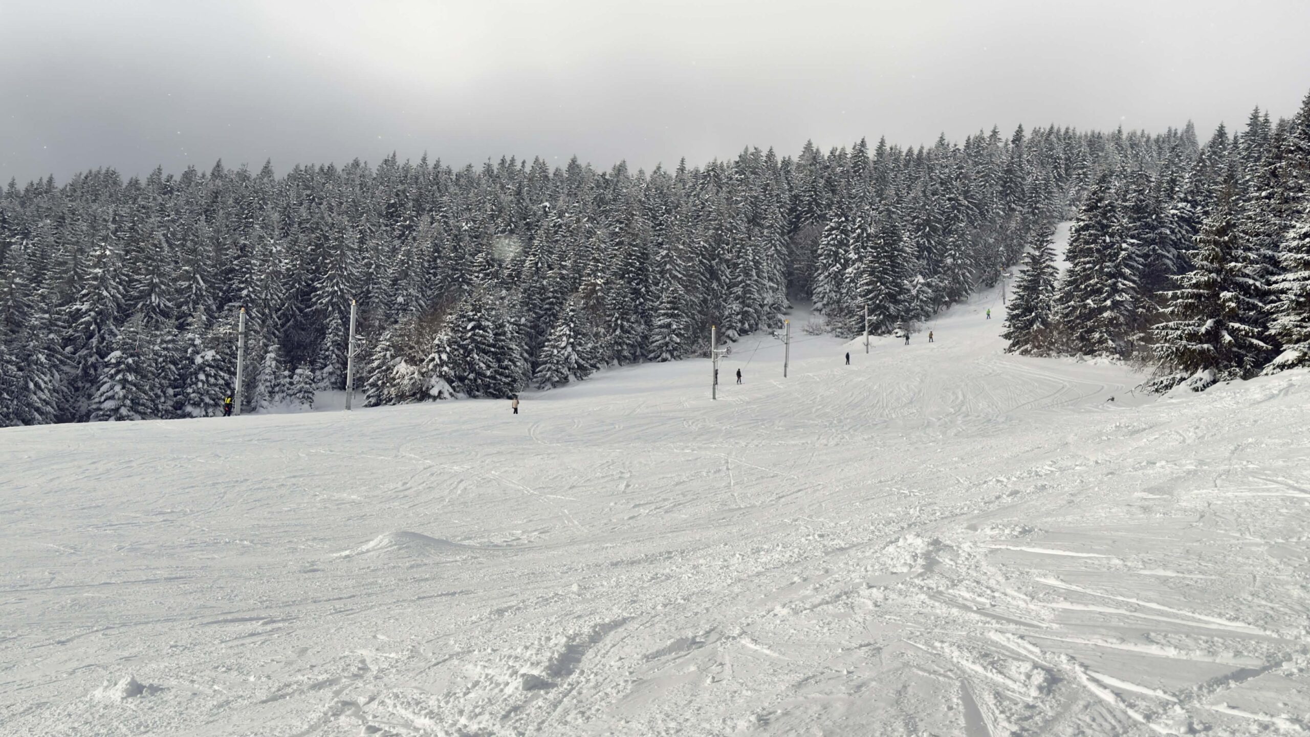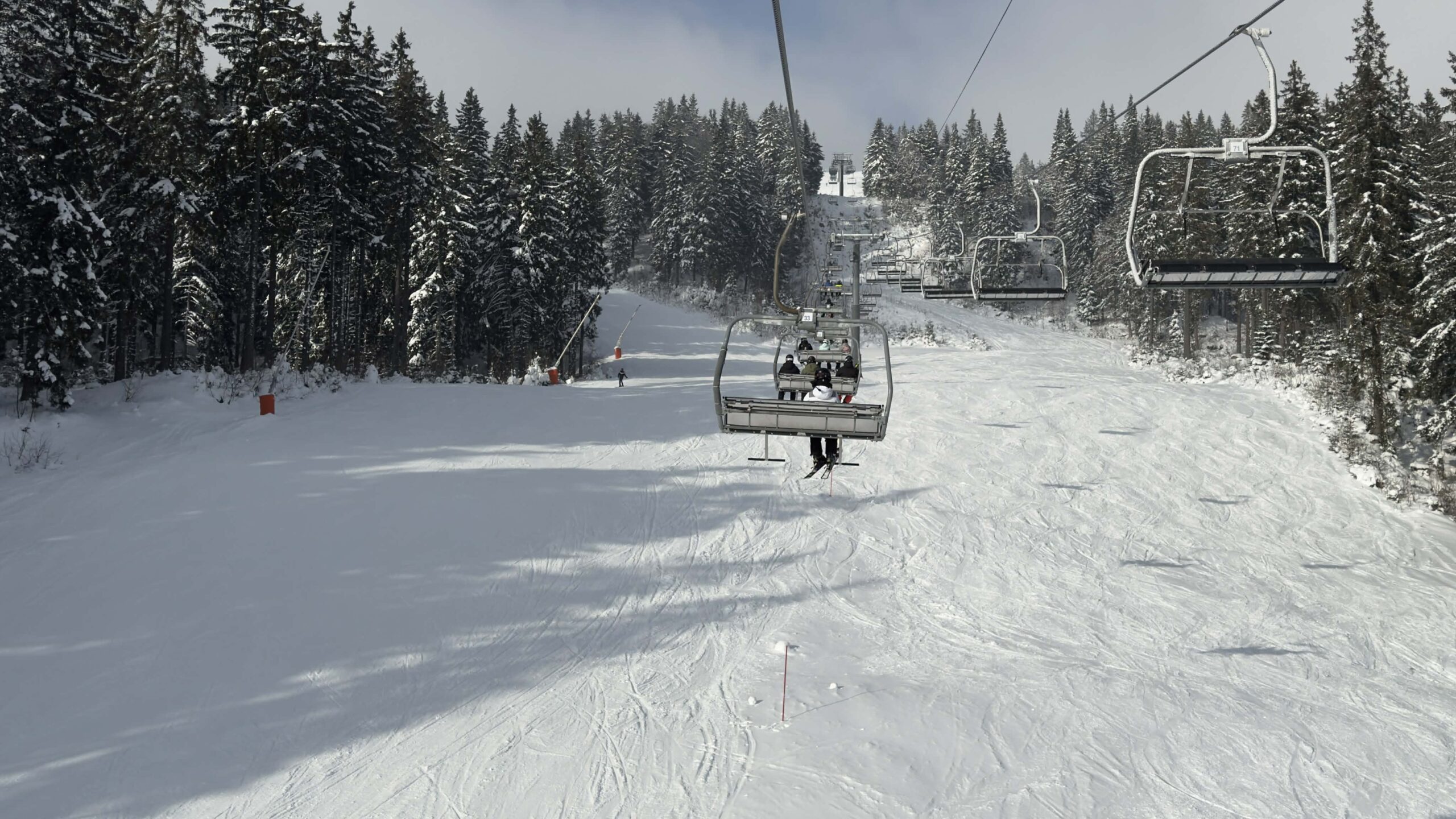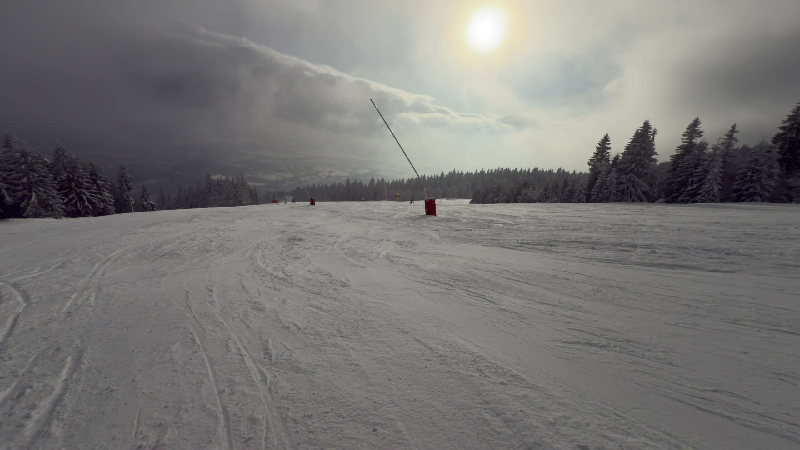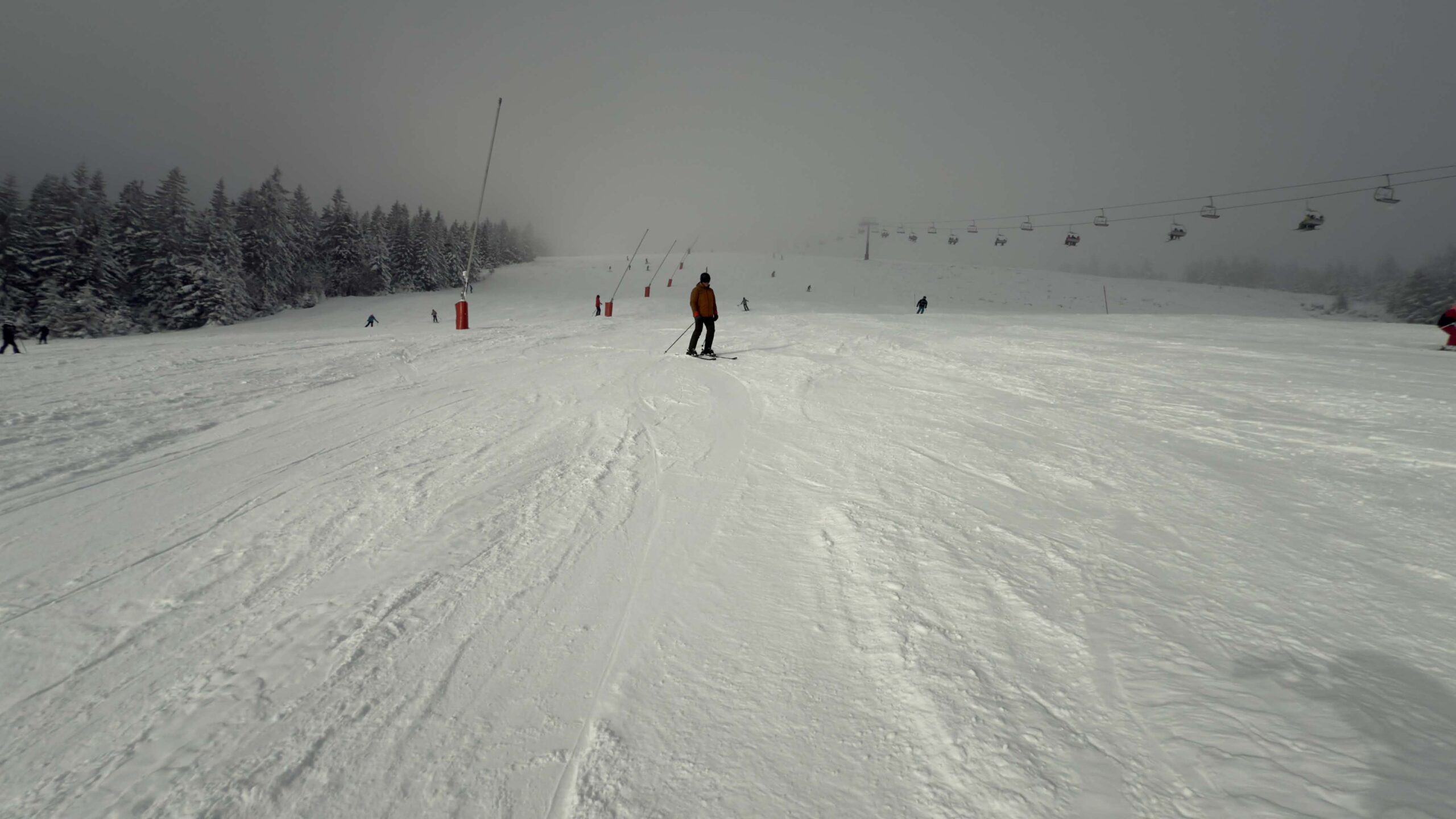 Pierwsze zjazdy dolnymi odcinkami odbywały się w lekkim mrozie i bardzo dobrych warunkach śniegowych. W środkowej części stoku pojawiła się gęsta mgła, która ograniczała widoczność i wymuszała spokojniejszą jazdę. Ten fragment góry miał surowy, alpejski charakter – mleczne powietrze, przytłumione dźwięki i wyraźny kontrast między białą trasą a ciemnym lasem. Im wyżej, tym sytuacja się poprawiała. Po wyjechaniu ponad warstwę chmur trafiliśmy w pełne słońce i zupełnie inny świat – jasny, przestronny i widokowy.