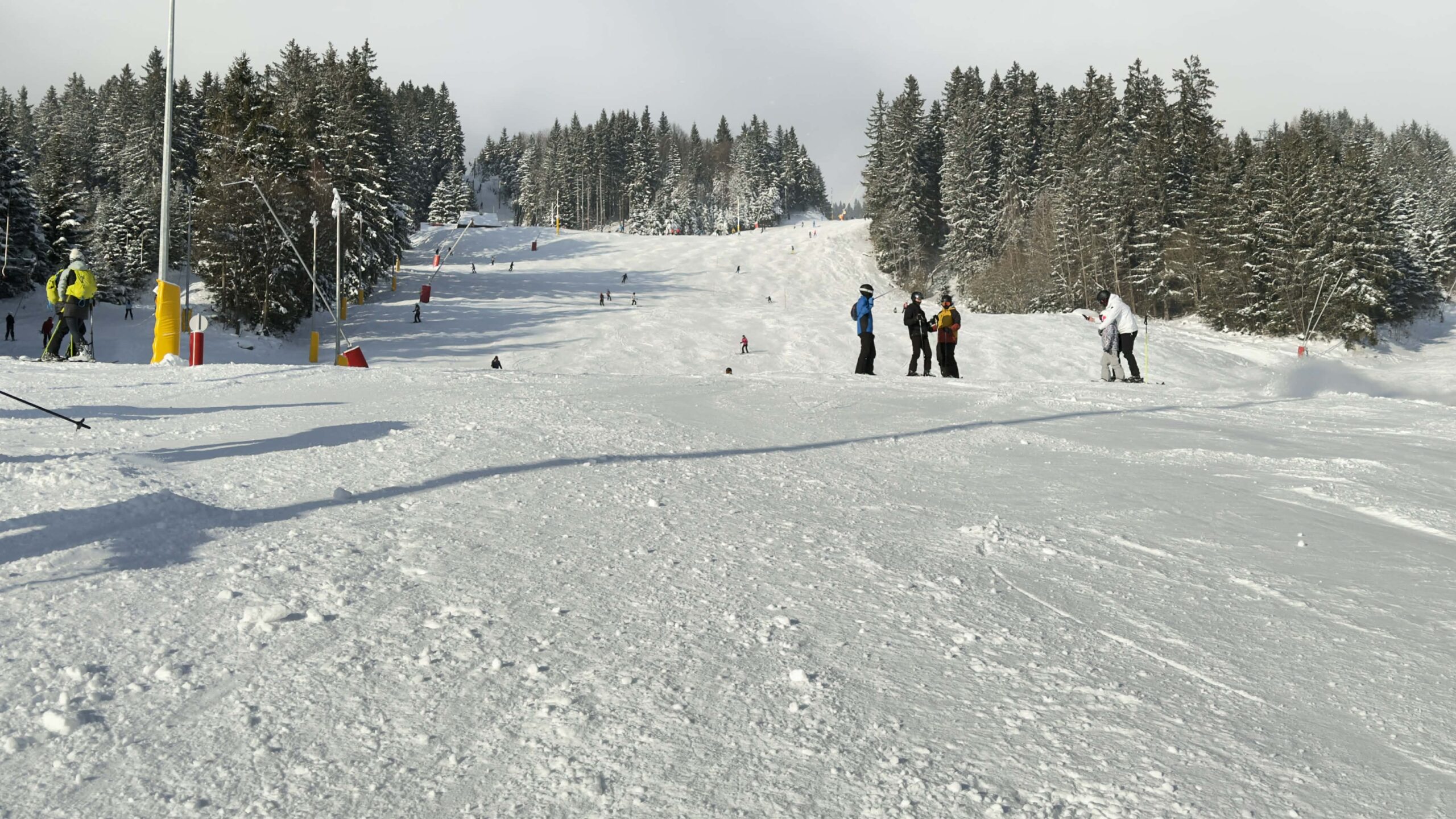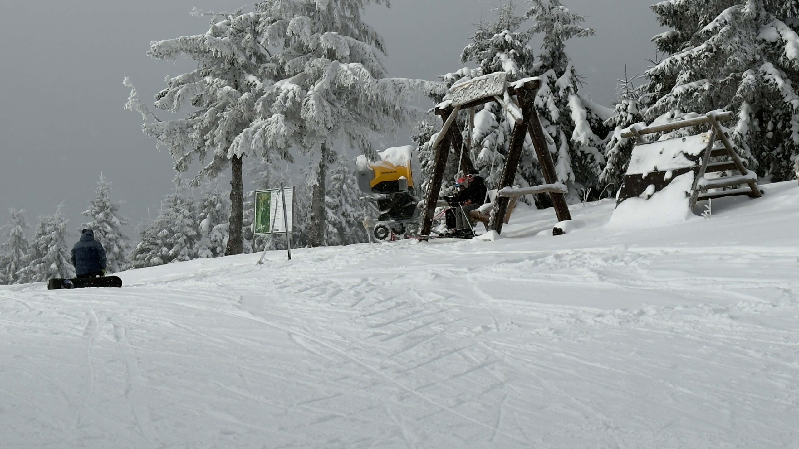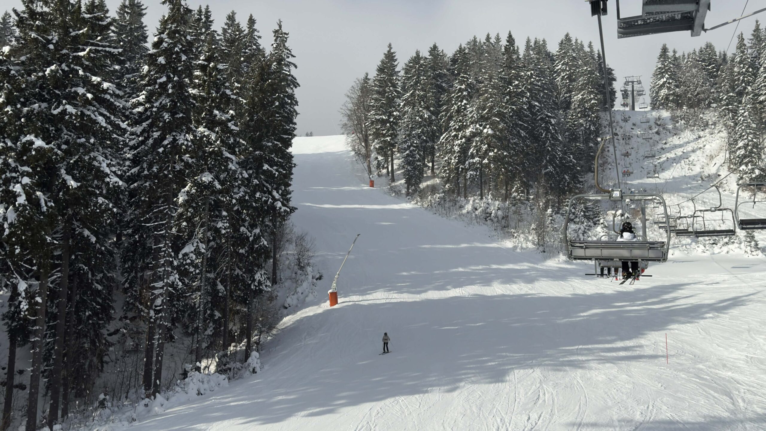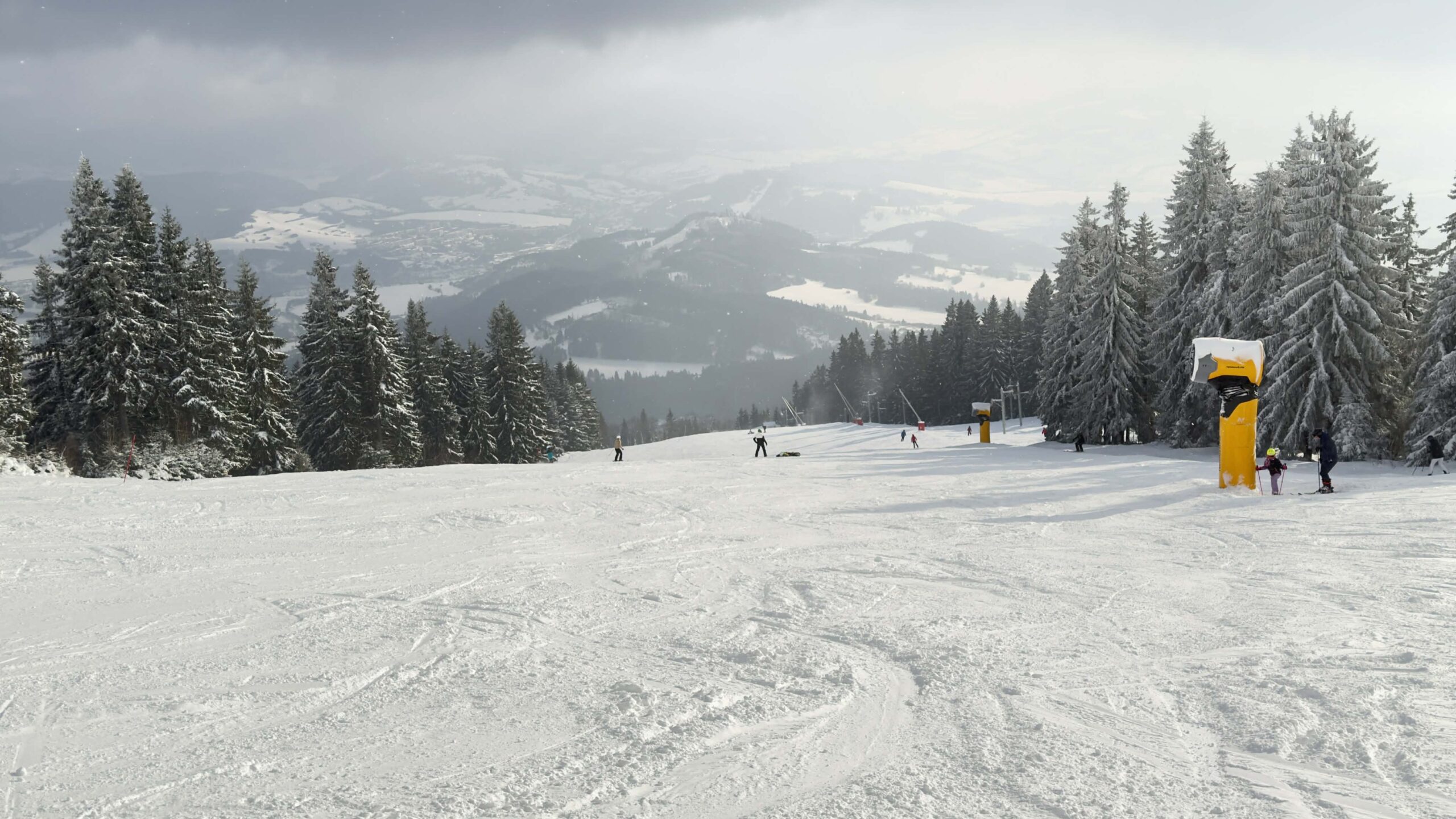 Pierwsze zjazdy dolnymi odcinkami odbywały się w lekkim mrozie i bardzo dobrych warunkach śniegowych. W środkowej części stoku pojawiła się gęsta mgła, która ograniczała widoczność i wymuszała spokojniejszą jazdę. Ten fragment góry miał surowy, alpejski charakter – mleczne powietrze, przytłumione dźwięki i wyraźny kontrast między białą trasą a ciemnym lasem. Im wyżej, tym sytuacja się poprawiała. Po wyjechaniu ponad warstwę chmur trafiliśmy w pełne słońce i zupełnie inny świat – jasny, przestronny i widokowy.
