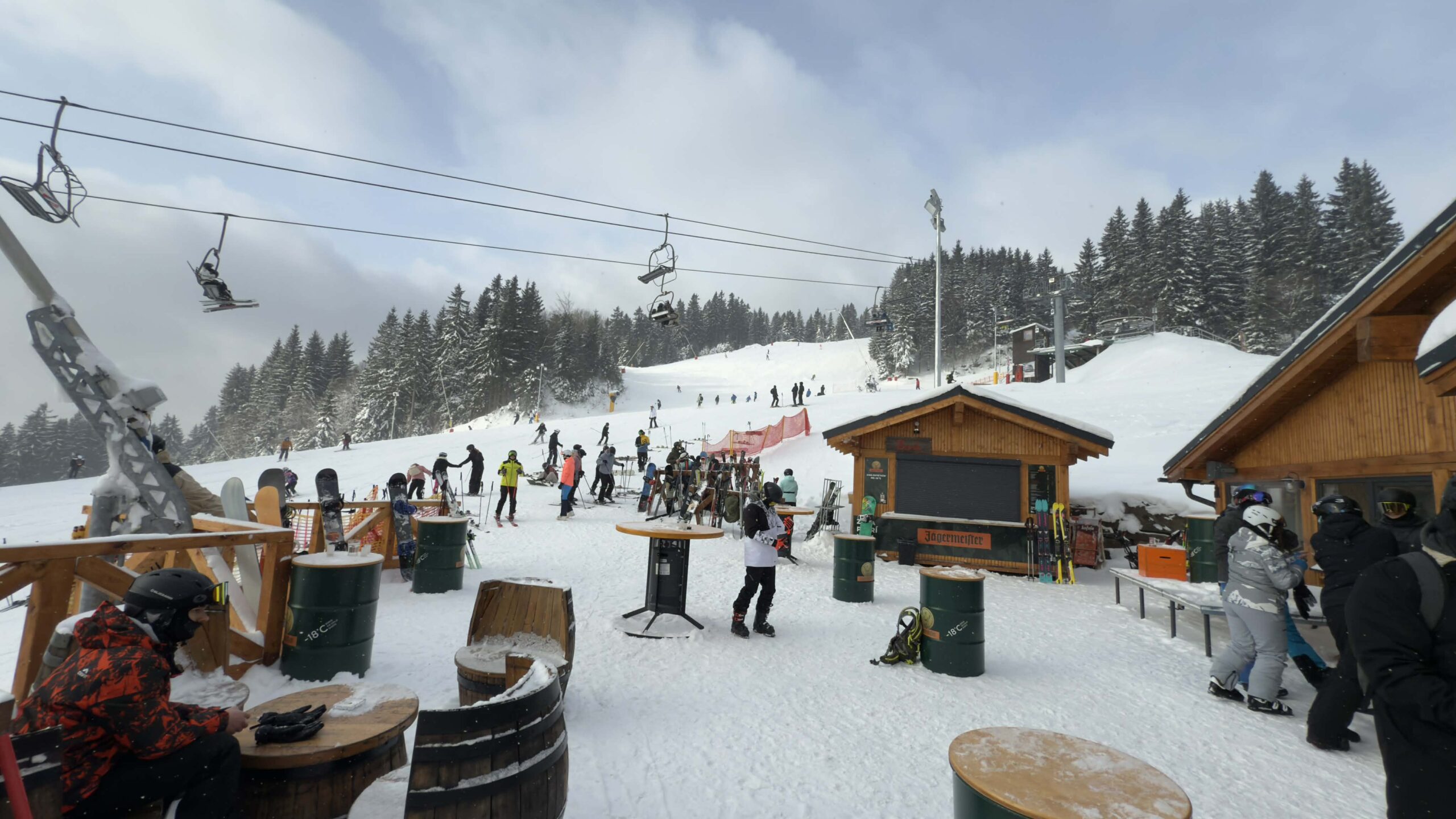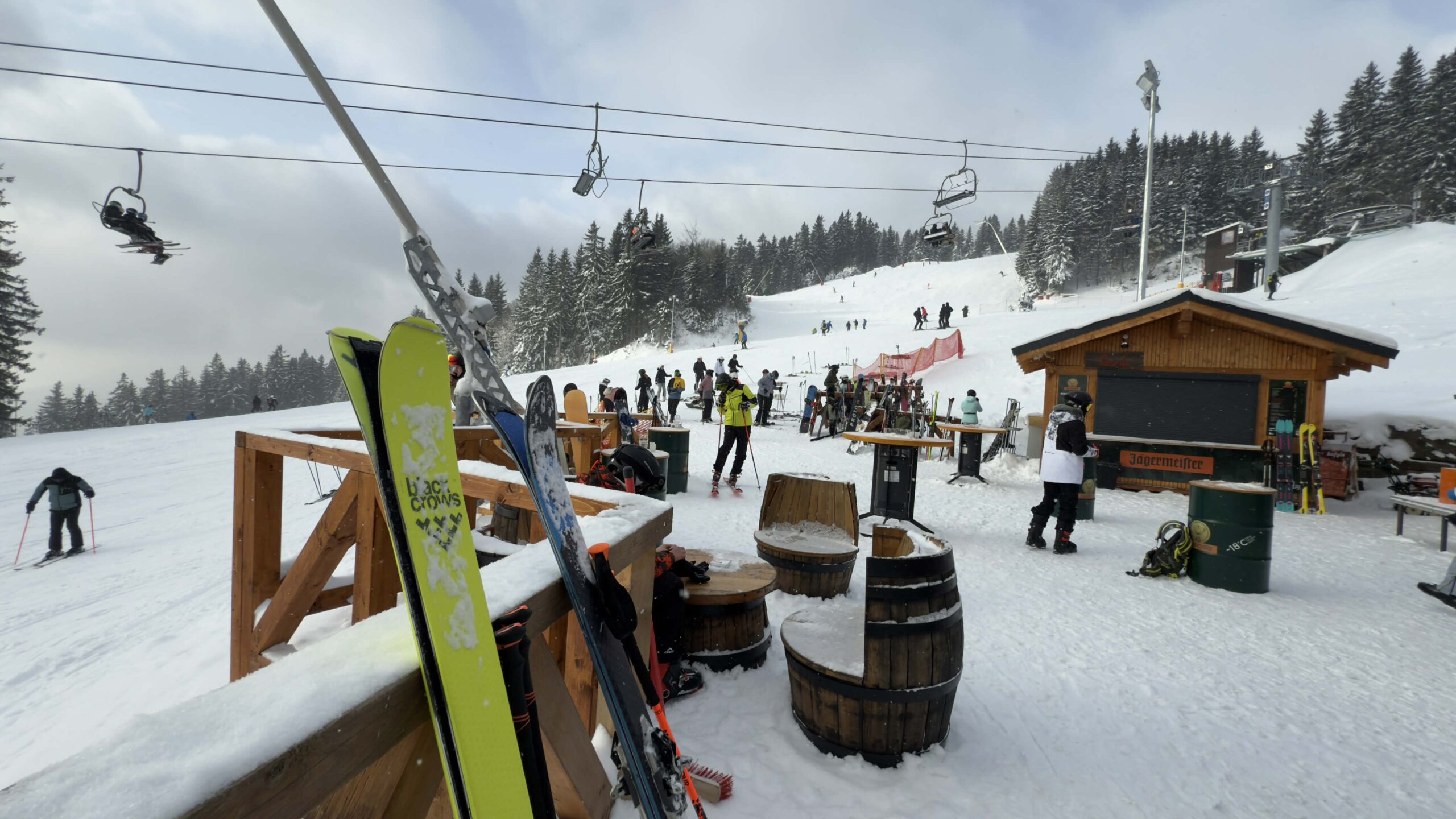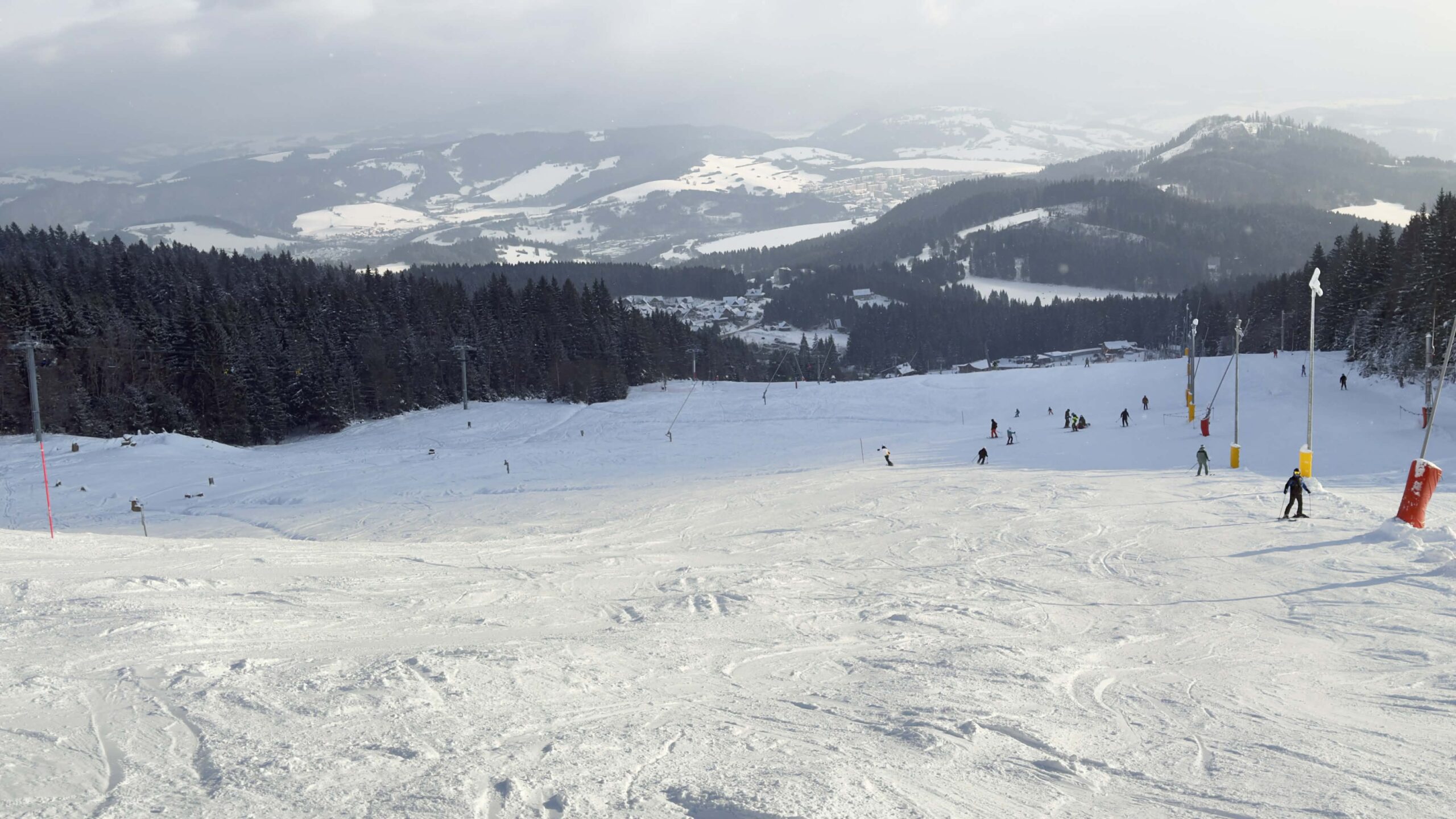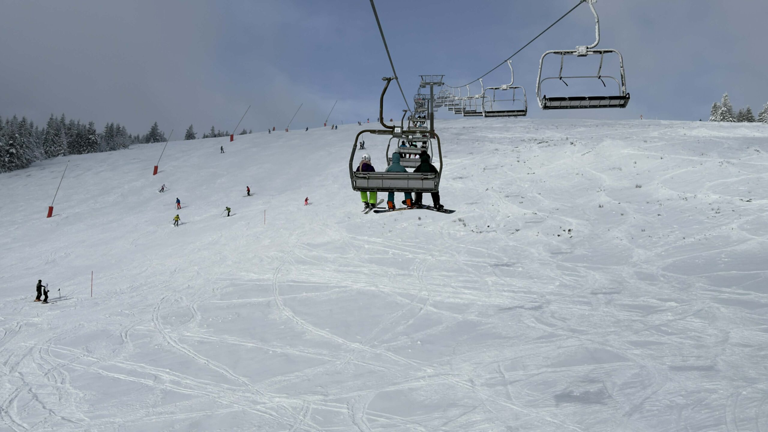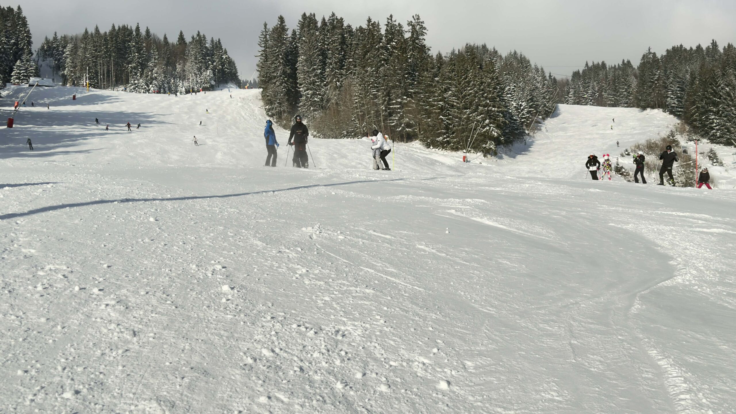 Pierwsze zjazdy dolnymi odcinkami odbywały się w lekkim mrozie i bardzo dobrych warunkach śniegowych. W środkowej części stoku pojawiła się gęsta mgła, która ograniczała widoczność i wymuszała spokojniejszą jazdę. Ten fragment góry miał surowy, alpejski charakter – mleczne powietrze, przytłumione dźwięki i wyraźny kontrast między białą trasą a ciemnym lasem. Im wyżej, tym sytuacja się poprawiała. Po wyjechaniu ponad warstwę chmur trafiliśmy w pełne słońce i zupełnie inny świat – jasny, przestronny i widokowy.