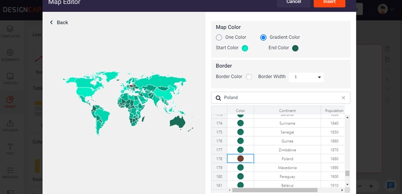 Kolejną ciekawą funkcją (której nie kojarzę z innych programów) jest tworzenie map. Na mapach można umieścić przeróżne informacje oraz dane liczbowe. Oprócz tego dostępne są też estetyczne wykresy oraz diagramy.