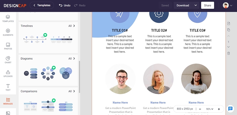 Ciekawą opcją, która zwróciła moją uwagę są gotowe moduły. Przydadzą się prawdopodobnie przy niektórych prezentacjach, broszurach oraz infografikach. Wystarczy jeden klik, zmiana treści i gotowe.