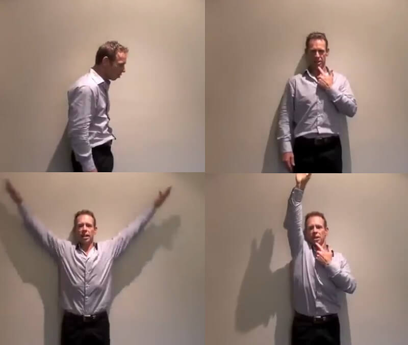 Pierwszą rzeczą jest przyjęcie prawidłowej postawy, czyli oparcie się o ścianę plecami i piętami. Chcę też schować podbródek, opuścić go i dotknąć ściany tyłem głowy. Dla niektórych osób może to być trudne, bo Twój stan jest już trochę zaawansowany. Nie możesz się cofnąć, bez względu na to, jak bardzo się starasz. Możemy więc położyć poduszkę za twoimi plecami i przytrzymać ją przy ścianie, trzymając podbródek wciągnięty. Pamiętaj, iż najłatwiejszym sposobem na dotknięcie ściany jest po prostu odchylenie głowy do tyłu. To nie przyniesie efektu, którego dla siebie chcemy. Musisz mieć podbródek wciągnięty.