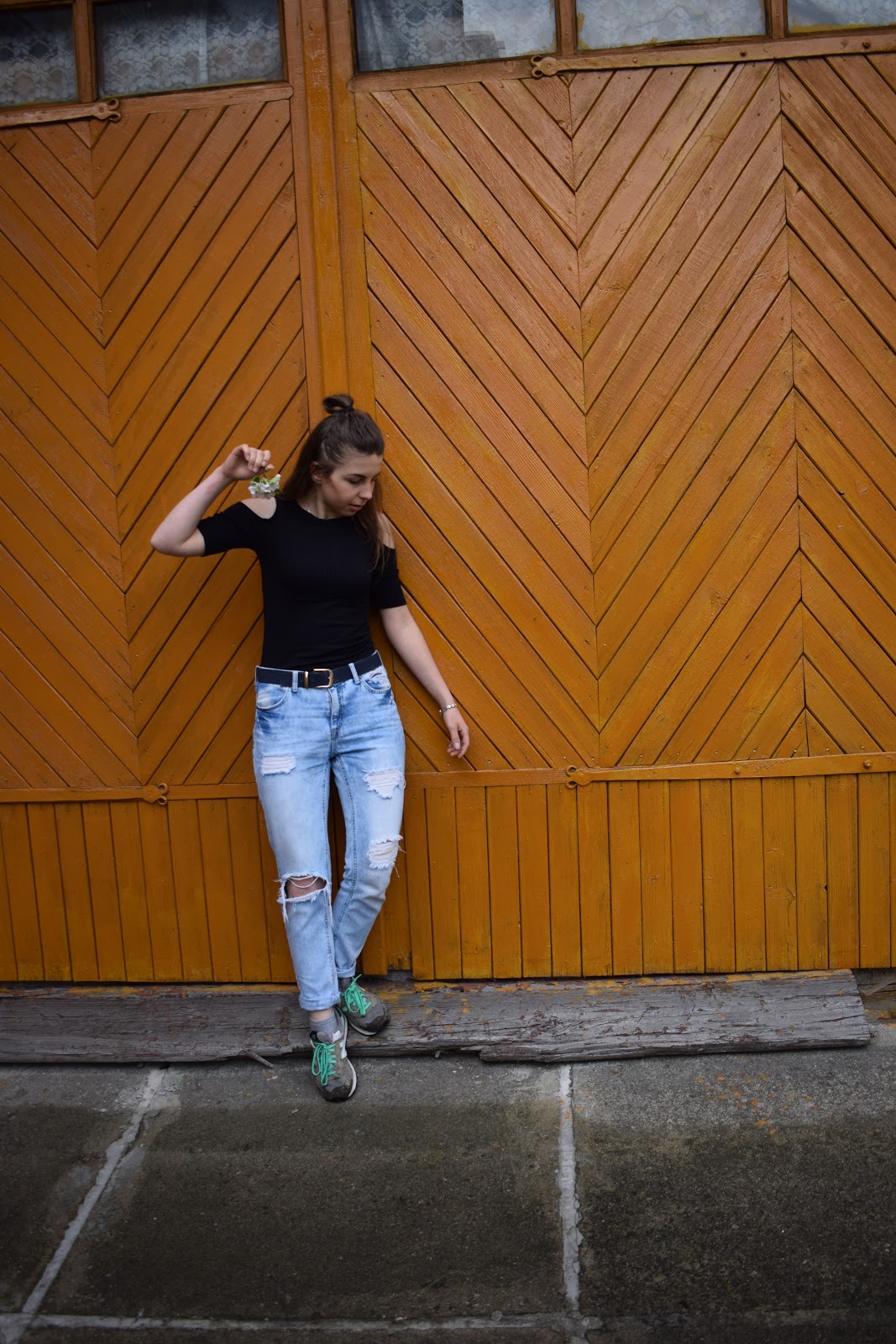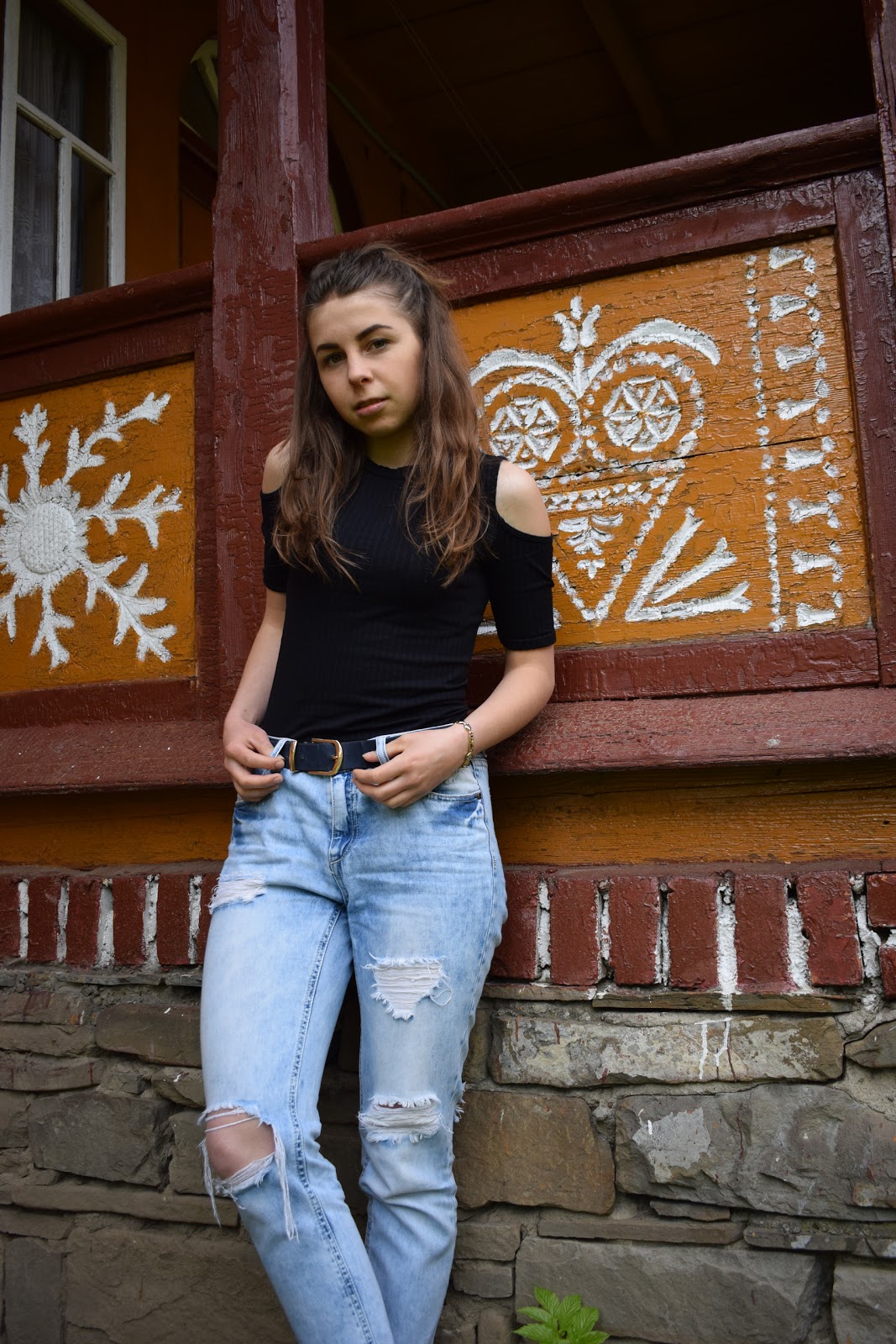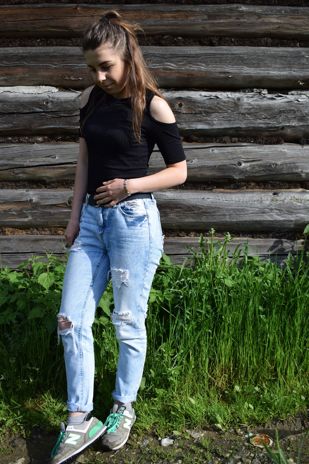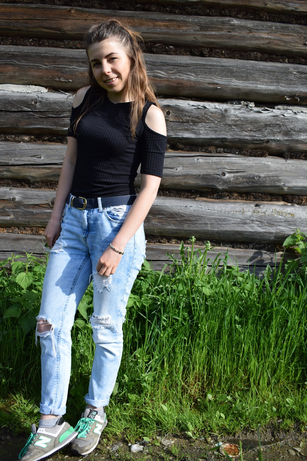 A dzisiaj nic nowego. Jeansy i top. Może jest to nudny ubiór, ale w tym czuję się nalepiej.