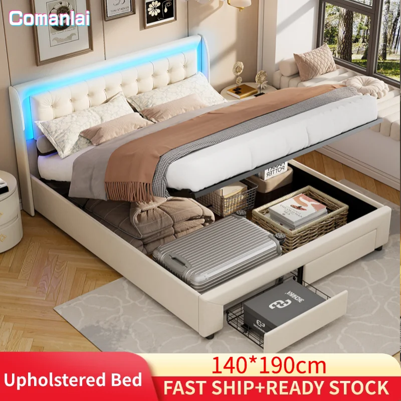 Comanlai 140 x 190 cm Upholstered Bed,Hydraulic Storage Bed,LED Bed with USB Charging Function,Without Mattress,Velvet,Beige