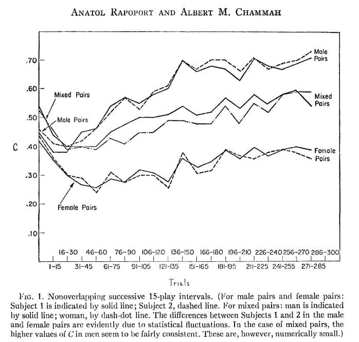 Wykres pokazuje odsetek zachowań „współpracy” w iterowanych dylematach więźnia: pary mężczyzn współpracują niemal dwukrotnie częściej niż pary kobiet. Źródło