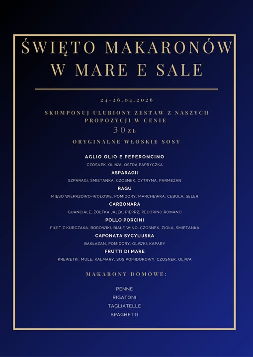 Domowej roboty penne, rigatoni, tagliatelle i spaghetti w zestawieniu z siedmioma najlepszymi sosami, które powstały z oryginalnych włoskich produktów: oliwy, parmezanu, sosów pomidorowych, ostrej papryczki, pecorino romano, krewetek, kalmarów, czy muli – to wszystko znajdziecie przez cały weekend w bocheńskiej Restauracji Mare e Sale.