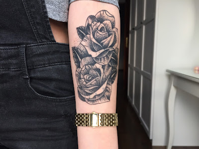 Dlaczego go zrobiłam? Już od dłuższego czasu planowałam jakąś 'dziarę', ale to był akurat totalny spontan, wydaje mi się, iż zrobiłam to by zakończyć jakiś 'etap' w moim życiu :) Dzień wcześniej zadzwoniłam do studia, ustalili mi termin na następny dzień na godzinę 11, w drodze do studia dopiero szukałam motywów (brawo ja), początkowo był on całkiem inny, ale niestety moja mamusia nie zgodziła się na czaszki, więc w ostatniej chwili postawiłam na róże, nie ma on żadnego ukrytego przekazu jak wszystkim się wydaje, jest taki a nie inny, bo taki mi się podobał :)