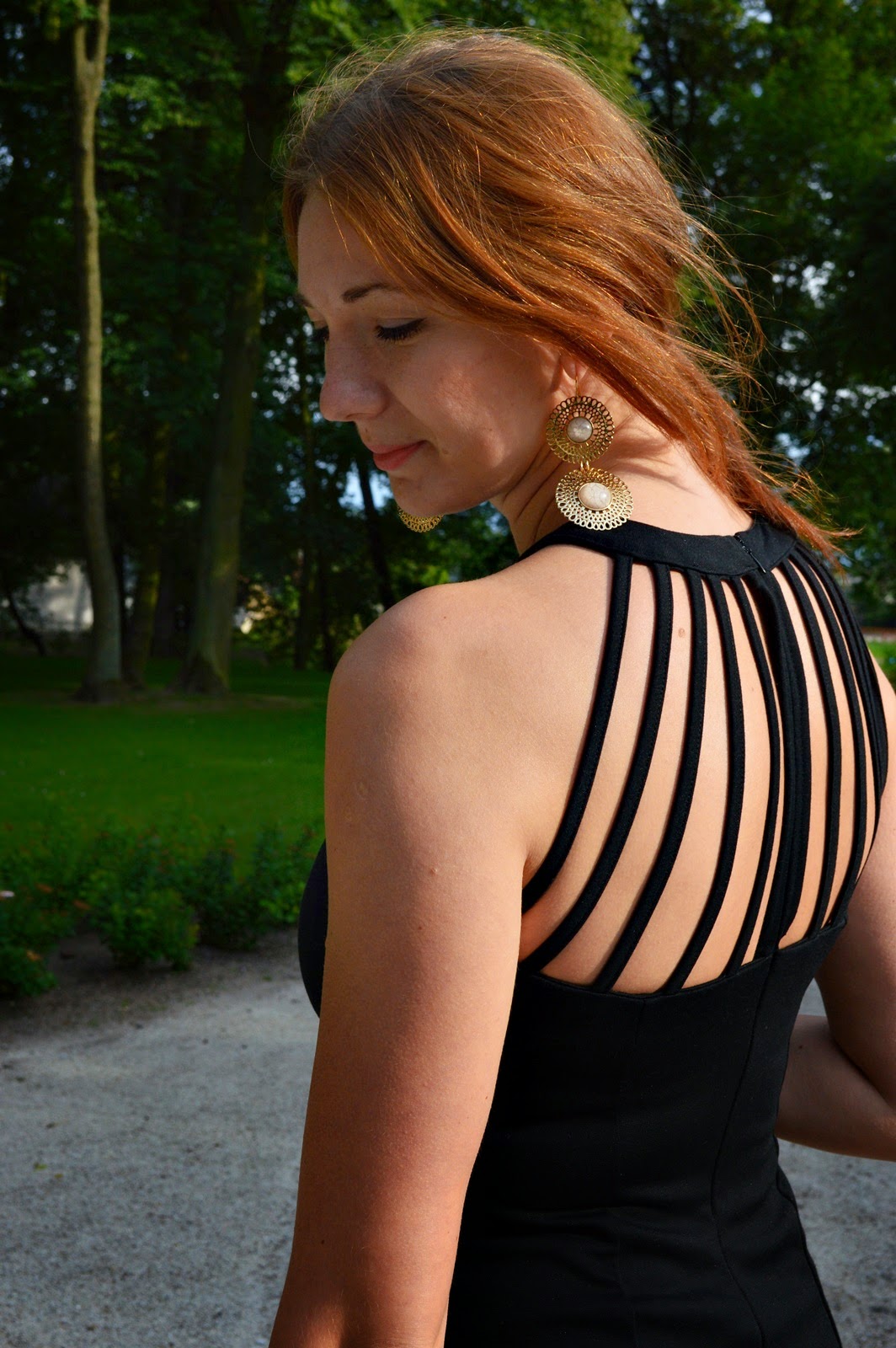 Dzisiejsza stylizacja jest propozycją na wieczorne wyjście. Czarna sukienka z efektownym zdobieniem na dekolcie oraz plecach, niewątpliwie przyciąga wzrok. Ciemnie okulary, duże kolczyki nadają jej charakteru glamour. Jest kobieco, zmysłowo.